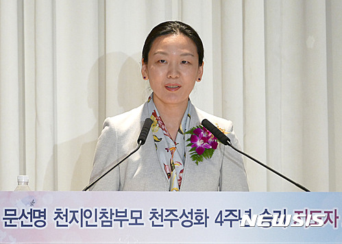 【서울=뉴시스】최동준 기자 = 11일 경기 수원 캐슬호텔에서 열린 '문선명 총재 4주기 추모 지도자 초청 보고회'에서 문연아 세계평화여성연합 세계 회장이 환영사를 하고 있다. 2016.09.11. (사진=세계평화통일가정연합 제공)