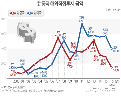 【서울=뉴시스】전진우 기자 = 12일 전국경제인연합회가 조사한 한국의 국가별 해외직접투자를 분석한 결과에 따르면, 전체 해외직접투자 가운데 대중국 직접투자 규모는 2000년 7억7000만달러에서 지난해 28억5000만달러로 15년 동안 약 4배 증가했다.
