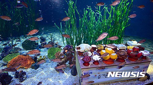 【부산=뉴시스】 하경민 기자 = 추석 연휴를 하루 앞둔 13일 부산아쿠아리움에서 직원과 어린이 홍보대사 등이 수중 차례상 퍼포먼스를 구경하고 있다. 2016.09.13.