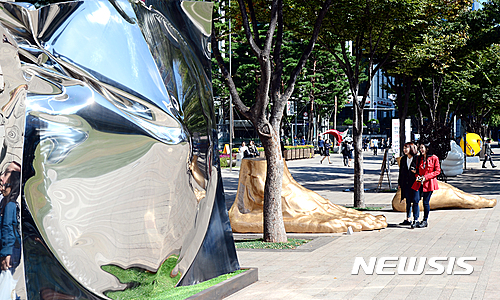 【서울=뉴시스】이종철 기자 = 시민들이 10일 서울 중구 서울광장에서 열린 '서울 아리랑페스티벌 야외조각전'에 전시되어 있는 작품들을 감상하고 있다. 서울시민들이 일상에서 예술을 향유할 수 있도록 계획된 이번 전시는 16일까지 열린다.   2016.10.10.
