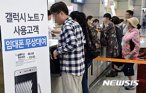 【인천공항=뉴시스】홍찬선 기자 = 잇따른 발화 사고로 항공기의 반입이 금지된 삼성전자의 '갤럭시노트7'으로 인해 해외로 떠나는 출국자들이 17일 인천공항 출국장 이동통신사 해외로밍센터에서 대체 임대폰을 수령받고 있다.