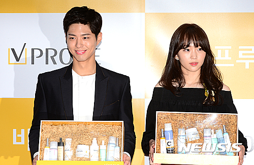【서울=뉴시스】이종철 기자 = 28일 더마 코스메틱 브랜드 비프루브 런칭을 기념하여 모델 박보검과 진기주가 서울 명동 직영 매장 오픈식에 참석하여 제품을 들고 포즈를 취하고 있다. 2016.10.28.