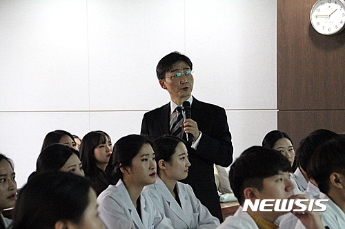 【대구=뉴시스】정창오 기자 = 아주대병원 외상외과장 이국종 교수가 25일 대구과학대학교 국제세미나실에서 진행된 간호학과 특강에서 'Trauma Surgery'라는 주제로, 강연을 하고 있다. 2016.11.25.(사진=대구과학대 제공)