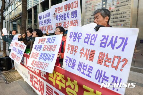 【서울=뉴시스】김진아 기자 = 서울교육단체협의회 관계자들이 13일 오후 '최순실 국정농단' 사태 규명을 위해 꾸려진 특별검사팀 사무실이 위치한 서울 강남구 대치동에 앞에서 특검 박주성 검사 규탄 기자회견을 하고 있다.