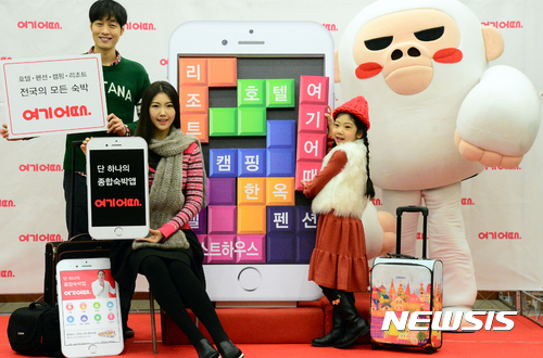 【서울=뉴시스】이종철 기자 = 21일 서울 종로구 세종문화회관 예인홀에서 모델들이 숙박애플리케이션 '여기 어때'의 새로운 서비스 종합숙박 O2O을선보이고 있다.