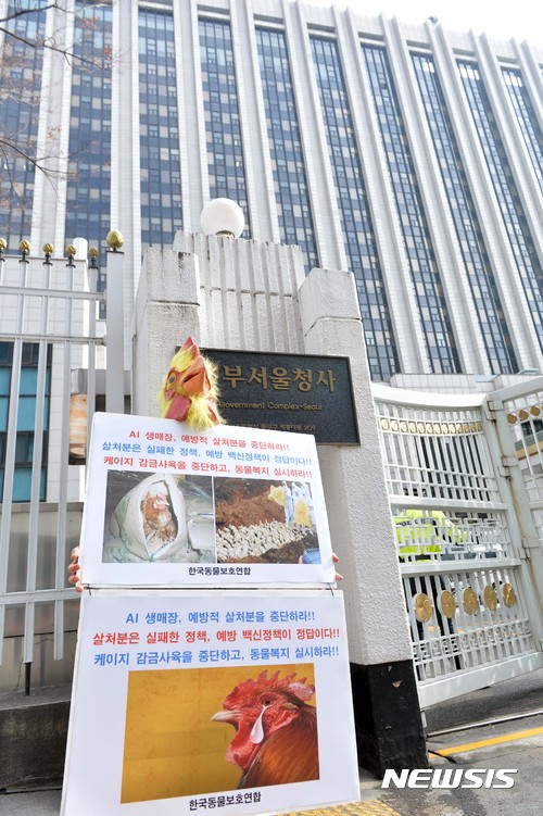 【서울=뉴시스】신태현 기자 = 23일 오후 서울 종로구 정부서울청사에서 한국동물보호연합 관계자가 조류인플루엔자(AI) 관련 예방적 살처분 중단 및 동물복지 실시 등의 대책마련을 촉구하며 1인 시위를 하고 있다. 2016.12.23.