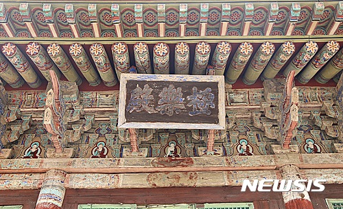 【제천=뉴시스】강신욱 기자 = 충북도와 제천시는 덕산면 월악리 신륵사 극락전을 올해 봄에 전면 해체해 보수한다. 5일 극락전 외벽에 그려진 여래상과 단청이 고색창연하다. 2017.01.05.