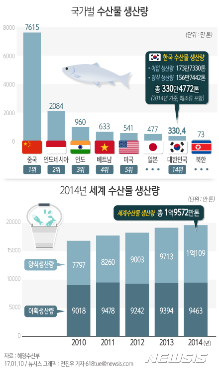 【서울=뉴시스】전진우 기자 = 10일 해양수산부가 발표한 유엔 식량농업기구(FAO)가 최근 발표한 '세계수산양식현황' 보고서에 따르면 우리나라가 지난 2014년 기준 어획업 부문 생산량 173만7330톤, 양식업 부문 생산량 156만7442톤 등 총 330만4772톤의 수산물을 생산해 세계 14위를 차지했다.