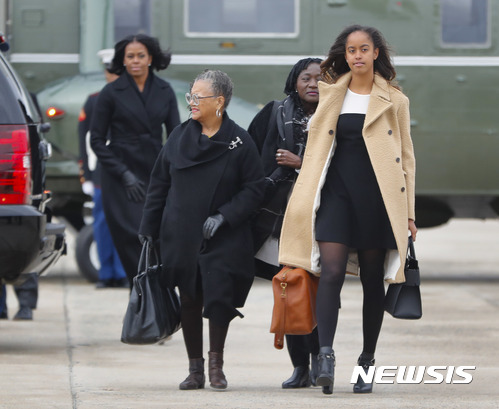 【 앤드루스공군기지=AP/뉴시스】버락 오바마 미국 대통령의 맏딸 말리아(오른쪽)가 10일(현지시간) 아버지의 임기 마지막 연설회에 참석하기 위해 메릴랜드주 앤드루스공군기지에 도착해 전용기를 향해 걸어가고 있다.  2017.01.11