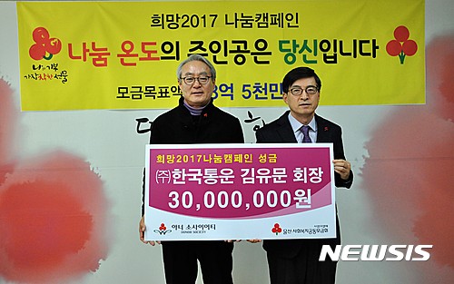 【울산=뉴시스】조현철 기자 = (주)한국통운 김유문 회장(아너 52호)이 11일 울산사회복지공동모금회를 방문해 이웃돕기 성금 30000만원을 기탁했다. 2017.01.11. (사진=울산사랑의 열매 제공)