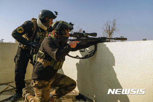 【모술=AP/뉴시스】이라크 특수부대가 19일(현지시간) 모술 동부에 있는 니네베흐 호텔 옥상에서 감시하고 있다. 이라크 군은 이날 모술의 상징적인 건물인 이 호텔을 점령하고 모술 동부를 탈환했다. 2017.01.20