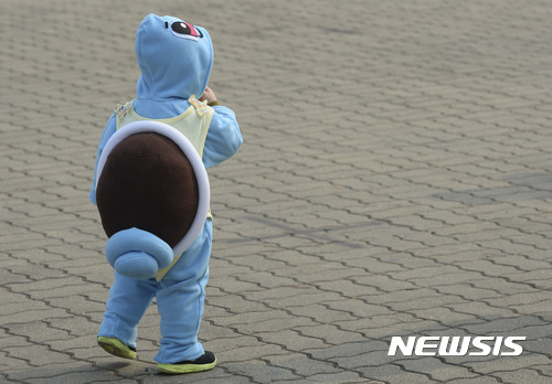【서울=뉴시스】최진석 기자 = 개구리가 겨울잠에서 깨어난다는 경칩인 5일 오후 서울 마포구 상암동 평화의 공원에서 한 어린이가 포켓몬스터 꼬부기 캐릭터 복장을 한 채 화창한 날씨를 즐기고 있다. 2017.03.05.