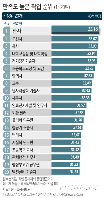 【서울=뉴시스】전진우 기자 = 27일 한국고용정보원이 우리나라의 621개 직업종사자 1만9127명을 대상으로 실시한 '직업만족도' 결과에 따르면 우리나라의 직장인들 가운데 만족도가 가장 높은 직업은 판사인 것으로 나타났다.