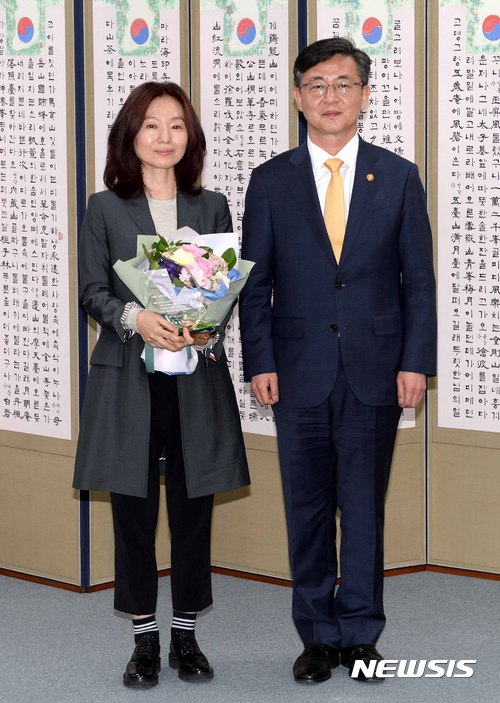 【서울=뉴시스】고범준 기자 = 홍용표 통일부 장관이 10일 오후 서울 종로구 남북회담본부 접견실에서 열린 MBC 드라마 '불어라 미풍아' 감사패 전달식에 참석해 김사경 작가에게 감사패를 전달하고 기념촬영을 하고 있다. 2017.04.10.