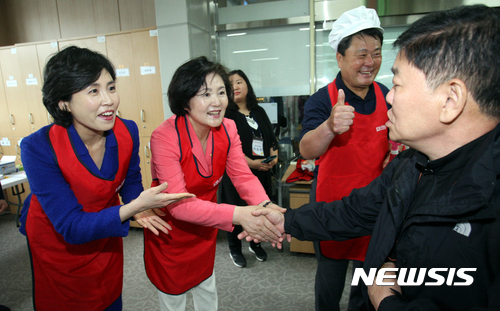 【광주=뉴시스】신대희 기자 = 20일 광주 남구 빛고을 노인건강타운에서 배식 봉사에 나선 더불어민주당 문재인 대선후보 부인 김정숙 여사가 문 후보 지지를 호소하고 있다. 김 여사 왼쪽은 이재명 성남시장 부인 김혜경씨, 오른쪽은 김성한 전 기아타이거즈 감독. 2017.04.20.