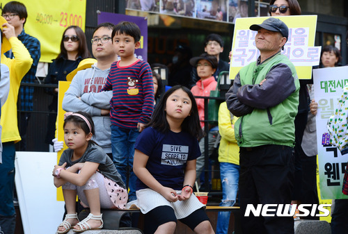 【대전=뉴시스】임태훈 기자 = 24일 오후 대전광역시 유성구 충남대학교 옆 궁동 로데오거리에서 아빠를 따라나온 어린들과 시민들이 심상정 정의당 대선후보의 유세를 경청하고 있다. 2017.04.24.