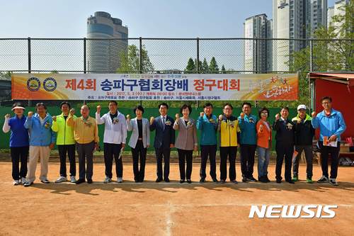 【서울=뉴시스】박춘희 송파구청장은 3일, 성내천 테니스장에서 열린 ‘제4회 송파협회장배 정구대회’에 참석해 선수들에게 격려의 말을 전하고 열띤 경기를 응원했다. 이날 정구대회에는 더운 날씨에도 불구하고 총 40개팀 160여명이 출전해 열전을 벌였다. 2017.05.03. (사진=송파구청 제공)