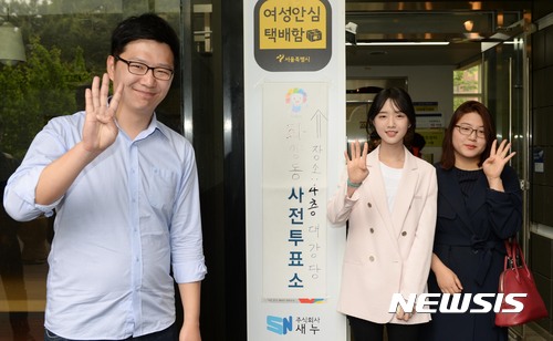 【서울=뉴시스】홍효식 기자 = 유승민 바른정당 대선후보의 아들 유훈동(왼쪽부터) 씨, 유훈동 씨 부인, 딸 유담 씨가 4일 오후 서울 광진구 화양동 주민센터에 마련된 투표소에서 사전투표를 마친 뒤 인증 사진을 찍고 있다. 2017.05.04.