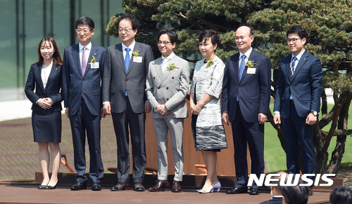 【수원=뉴시스】이정선 기자 = 이재현 CJ그룹 회장과 김희재 여사, 임원들이 17일 오전 경기 수원 CJ블로썸파크에서 열린 온리원 컨퍼런스에 참석, 기념식수를 마친 뒤 기념촬영을 하고 있다.