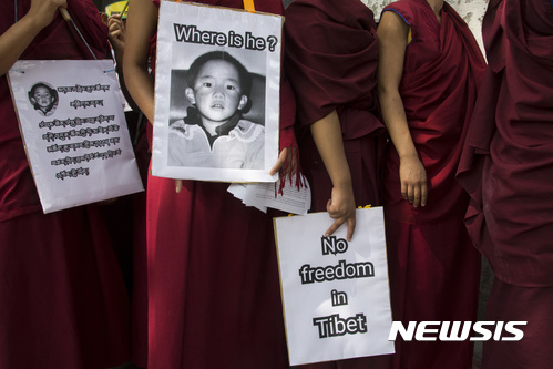 【다름살라=AP/뉴시스】인도 다름살라에서 17일 티베트 불교 승려들이 11대 판첸라마 겐둔 치아키 니마의 어린 시절 사진을 들고 중국정부에 그의 석방을 촉구하는 시위를 벌이고 있다. 1995년 달라이 라마가 11대 판첸라마 환생자로 지목했을 당시 6세였던 겐둔 치아키 니마는 중국 당국에 의해 가택연금된 상태로 현재까지 살고 있는 것으로 알려졌다. 판첸라마는 티베트불교에서 달라이 라마에 뒤이은 2인자이다. 2017.05.18