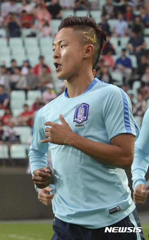 【전주=뉴시스】최진석 기자 = 20일 오후 전북 전주시 전주월드컵경기장에서 열린 '국제축구연맹(FIFA) U-20 월드컵 코리아 2017' 대한민국과 기니의 개막전 경기에 앞서 이승우가 몸을 풀고 있다. 2017.05.20.