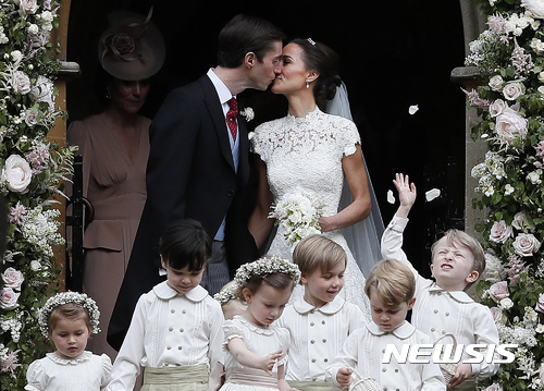 【잉글필드=AP/뉴시스】영국의 케이트 세손비(공식 명칭 캠브리지 공작부인) 동생 피파 미들턴이 20일(현지시간) 잉글필드 세인트 마크스 교회에서 결혼식을 마친 후 남편인 헤지펀드 매니저 제임스 매슈스와 키스하고 있다.앞줄 오른쪽 두번째가 화동 역할을 한 조지 왕자이고, 왼쪽 끝이 샬럿 공주이다. 2017.06.21