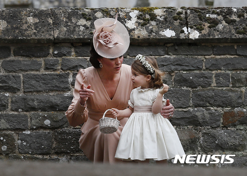 【잉글필드=AP/뉴시스】영국의 케이트 세손비(공식 명칭 캠브리지 공작부인)가 20일(현지시간) 잉글필드 세인트 마크스 교회에서 열린 동생 피파의 결혼식에 앞서 화동 역할을 맡은 딸 샬럿 공주에게 무엇인가 말하고 있다. 2017.06.21