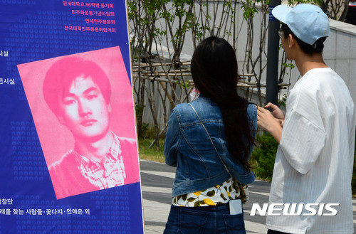 【서울=뉴시스】박주성 기자 = 9일 오후 이한열 열사의 30주기 추모제가 열리는 서울 서대문구 연세대학교에 학생들이 이한열 열사의 사진을 바라보고 있다. 2017.06.09.