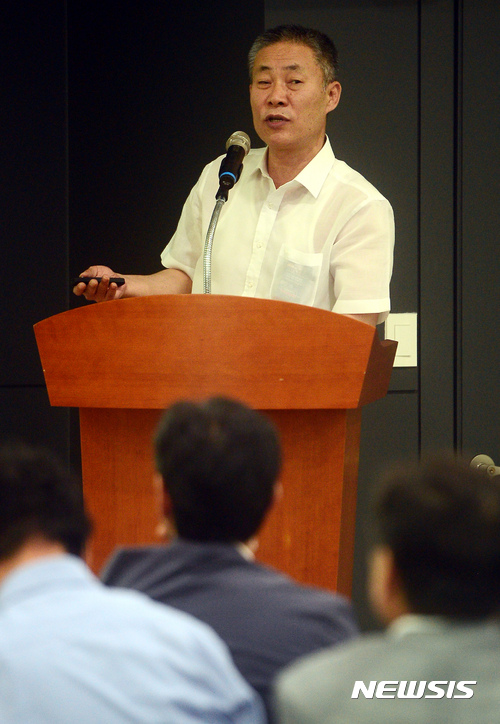 【서울=뉴시스】조성봉 기자 = 23일 오후 서울 종로구 서울글로벌센터 국제회의장에서 열린 2017 상반기 서울시 물관리 정책 세계화를 위한 민관협력포럼에서 김준형 서울시 물재생계획과 팀장이 '서울시 물관리 정책 현재와 미래'에 대해 발표를 하고 있다. 2017.06.23.