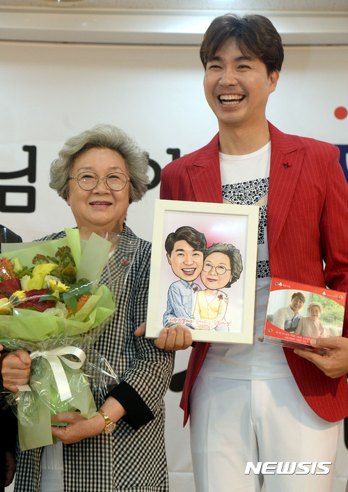 【서울=뉴시스】조성봉 기자 = 27일 오후 서울 중구 사랑의열매 사회복지모금공동회 대강당에서 열린 착한가정 가입식에서 홍보대사 박수홍(오른쪽)과 어머니 지인숙 씨가 기념품을 전달받고 환하게 미소짓고 있다.
