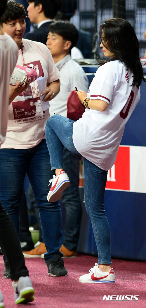 【서울=뉴시스】박주성 기자 = 4일 오후 서울 구로구 고척스카이돔에서 열린 2017 KBO 리그 한화 이글스 대 넥센 히어로즈의 경기 전 배우 송지효가 마운드에 오르기 전에 시구 연습을 하고 있다. 2017.07.04.