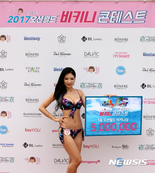 【서울=뉴시스】8일 강원도 홍천군 비발디파크 오션월드에서 열린 '2017 오션월드 비키니 컨테스트'에서 1위를 차지한 김지희가 포즈를 취하고 있다. 2017.07.08. (사진=대명레저산업 제공)