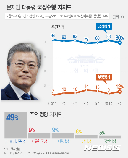 [그래픽]문재인 대통령 지지율 80%···전주대비 3%p↓(갤럽)