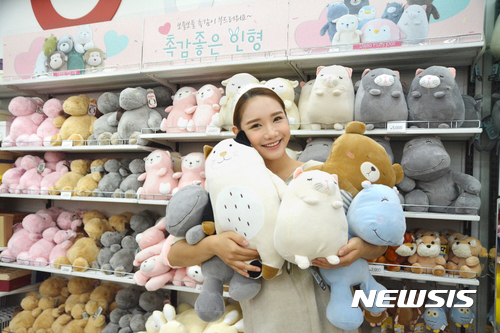 【서울=뉴시스】 3일 서울 다이소 동서울터미널점에서 모델이 다이소 동물 인형 시리즈를 소개하고 있다.