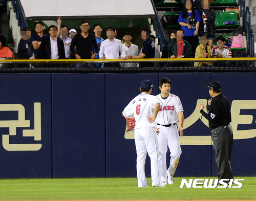 【서울=뉴시스】박주성 기자 = 29일 오후 서울 잠실야구장에서 열린 2017 KBO 리그 롯데 자이언츠 대 두산 베어스 경기, 8회초 롯데 팬들이 두산 좌익수 김재환에게 욕설을 하고 있다. 2017.08.29.