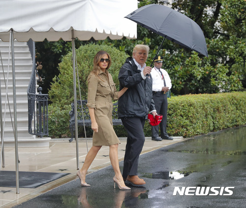 【워싱턴=AP/뉴시스】도널드 트럼프 미 대통령과 부인 멜라니아 여사가 2일 텍사스주와 루이지애나주 수재 지역을 방문하기 위해 백악관을 나서고 있다. 멜라니아는 이날도 궆높은 구두를 신은 뒤 휴스턴에 내리기 전에야 운동화로 갈아신었다. 지난달 29일 첫 휴스턴 방문 때 그녀가 궆높은 구두를 신은 것은 적절치 못했다는 비난을 불렀지만 멜라니아의 선택은 바뀌지 않았다. 2017.9.3