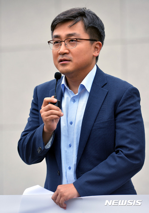 【서울=뉴시스】김선웅 기자 = 11일 오전 서울 서초구 대법원 앞에서 열린 현대차 비정규직·연대자에 대한 20억 손해배상판결 대법원 상고 기자회견에서 김태욱 금속법률원 변호사가 발언하고 있다.