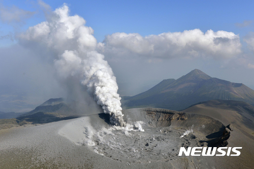 【신모에다케=AP/뉴시스】일본 미야자키 현과 가고시마 현 사이에 있는 신모에다케 화산에서 12일 연기가 솟아오르고 있다. 신모에다케 화산이 분화하기는  2011년 이후 6년 만이다. 2017.10.12