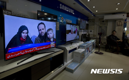 【이슬라마바드=AP/뉴시스】파키스탄 이슬라마바드의 한 상점에서 12일 미국과 캐나다인 부부와 세 자녀가 탈레반 연계 극단이슬람 무장조직에 피랍된지 5년만에 석방됐다는 뉴스가 TV를 통해 나오고 있다. 2017.10.17