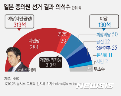 【서울=뉴시스】안지혜 기자 = 지난 22일 열린 일본 총선 개표 결과 집권 자민당은 284석, 연립여당인 공명당은 29석을 얻어 총 465석 가운데 313석을 차지했다.