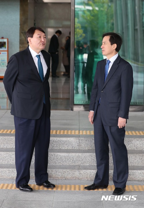【서울=뉴시스】조성봉 기자 = 서울고등검찰, 서울중앙지검 등에 대한 국회 법사위원회의 국정감사가 열리는 23일 오전 서울 서초구 서울고등검찰청 로비에서 조은석 서울고검장과 윤석열 (왼쪽)서울중앙지검장이 의원들을 기다리며 이야기를 나누고 있다. 2017.10.23.