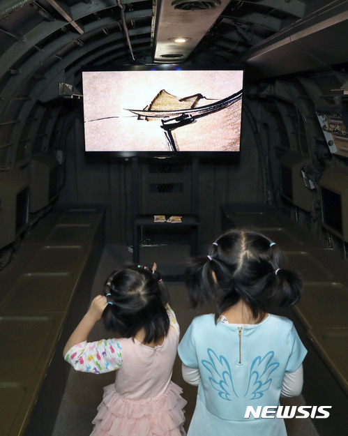 【서울=뉴시스】권현구 기자 = 24일 오후 서울 영등포구 여의도공원 'C-47 비행기 전시관'을 찾은 어린이들이 단편 애니메이션을 관람하고 있다.