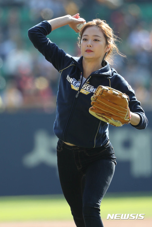 【서울=뉴시스】장세영 기자= 28일 오후 서울 잠실야구장에서 열린 2017 KBO 한국시리즈 3차전 두산 베어스와 KIA 타이거즈의 경기전, 배우 전소민 시구를 하고 있다.   2017.10.28.