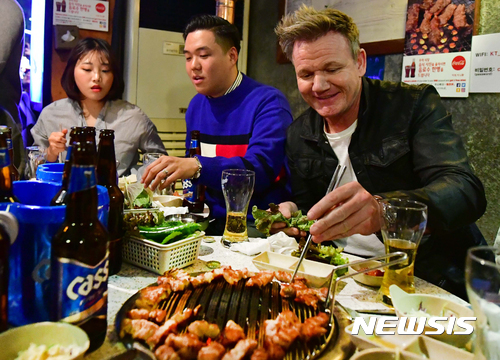 삼겹살에 카스 맥주 즐기는 고든 램지