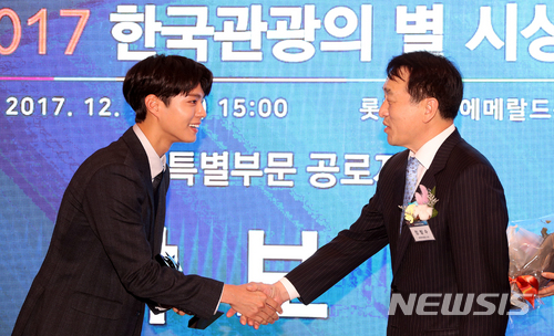 【서울=뉴시스】이종철 기자 = 문화체육관광부와 한국관광공사가 12일 서울 중구 소공동 롯데호텔 2층 에머랄드홀에서 개최한 '2017 한국관광의 별' 시상식에서 배우 박보검이 한국관광공사 정창수 사장으로 부터 특별분야 공로자부문을 수상하고 있다.