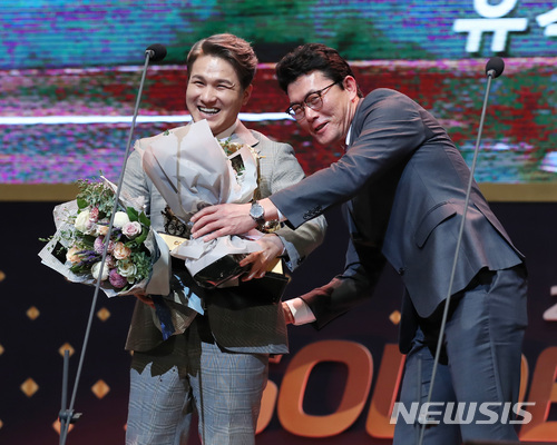 【서울=뉴시스】김진아 기자 = 13일 오전 서울 강남구 코엑스 오디토리움에서 열린 '2017 타이어뱅크 KBO 골든글러브' 시상식에서 골든글러브 유격수 부문을 수상 KIA 김선빈이 김민호 코치의 축하를 받고 있다. 2017.12.13.