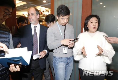 오헤아 킨타나 보고관 옆으로 중국에 있는 북한의 한 식당에서 일하다 국정원 등에 의해 한국에 강제 억류됐다고 주장하는 탈북자 김련희 씨가 기자들에게 한국정부에 북송을 요구 하고 있다. 2017.12.14.