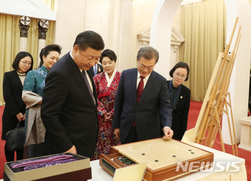 【베이징(중국)=뉴시스】문재인 대통령이 14일 오후(현지시각) 중국 베이징 인민대회당 국빈만찬장에서 시진핑 국가주석으로부터 옥으로 만든 바둑알과 바둑판을 선물 받고 있다. 2017.12.16. (사진=청와대 제공)