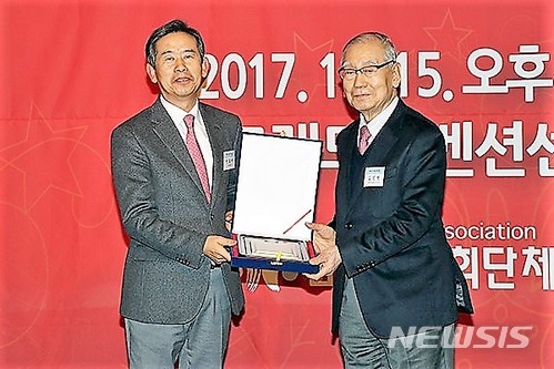 【울산=뉴시스】조현철 기자 = 자유한국당 울산동구당원협의회는 지난 15일 서울 그랜드컨벤션센터에서 범시민사회단체 연합 등 시민단체들이 합동으로 주최한 2017 시민사회단체 송년회 및 후원의 밤 행사에서 안효대 전 의원(동구당협 위원장)이 '좋은 정치인상'을 수상했다고 17일 밝혔다. 2017.12.17. (사진=자유한국당 동구당협 제공)