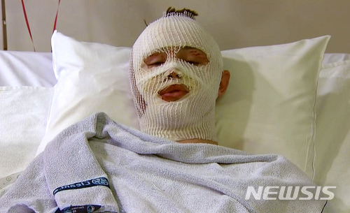 【겐트=AP/뉴시스】2016년 3월 25일 벨기에 브뤼셀 테러에서 부상을 입은 미국인 메이슨 웰스가 병상에서 언론과 인터뷰를 하고 있다. 웰스는 2013년 4월 미국 보스턴 마라톤테러에서도 극적으로 목숨을 건졌다. 2017.12.18.